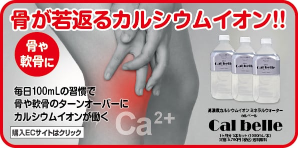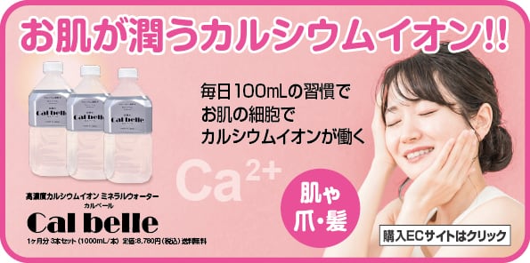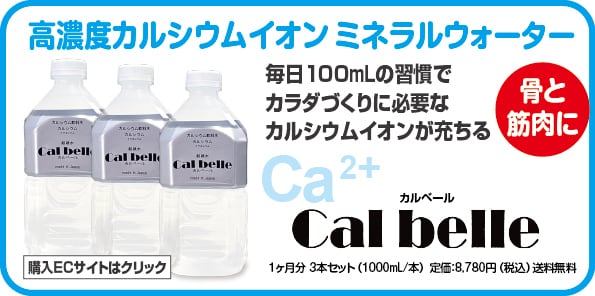 カルシウムイオン飲料「カルベール」は、良質で、安心・安全なカルシウムイオンを体内に直接に、素早く、高効率な吸収を実現しています。通常のカルシウムは胃で分解・消化されてカルシウムイオンになり腸で吸収されます。しかし、高濃度カルシウムイオン水「カルベール」は、ダイレクトに腸に届き素早く体内へ。吸収されたカルシウムイオンは、血流のスピードでカラダ全体に拡がります。その結果、骨芽細胞と破骨細胞による骨の生成・溶解機能「カルシウムバランス」を自然な状態で保持し、骨密度の低下を防ぎます。また全身のすべての細胞で働き、ターンオーバーにより若く保っています。体内のカルシウムイオンが充足された状態を保つことで、骨や筋肉、お肌が、年齢に合わせて維持されています。